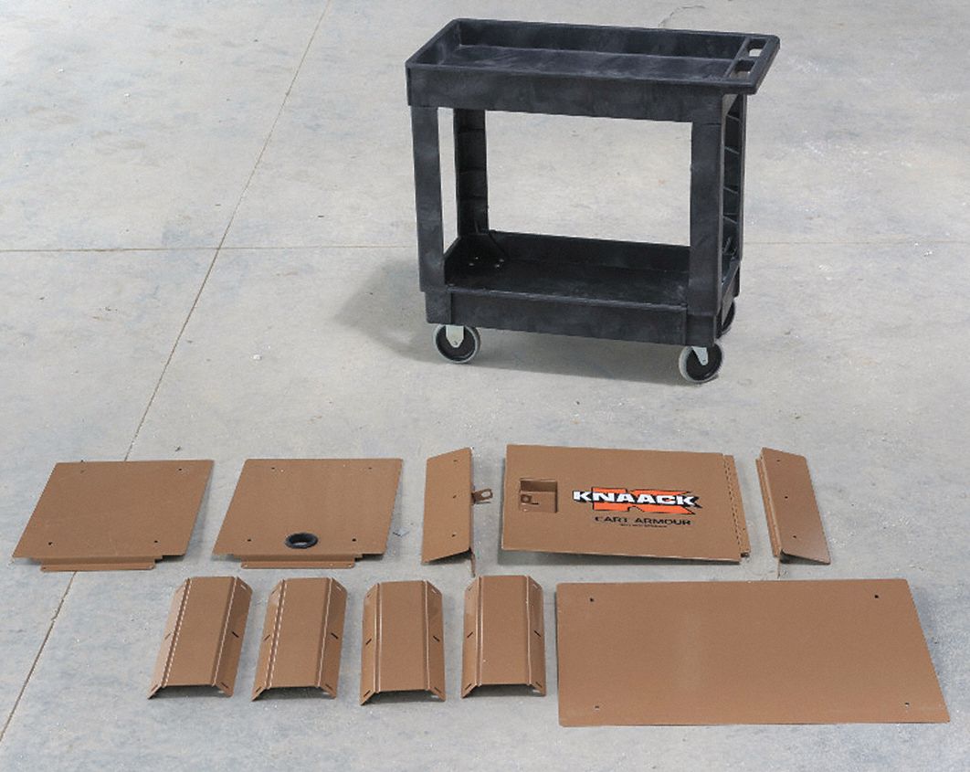 This utility cart is made with a durable structural foam core and polypropylene exterior that will not leak rust chip dent or peel and it features two shelves that can hold a wide variety of items.