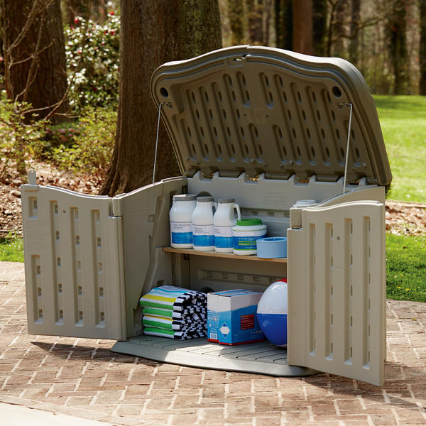 The vertical storage shed has a heavy duty impact resistant floor and can accommodate wood shelving. Additional information on our outdoor sheds can be found at. The convenient split lid allows you to access the shed from either side or open both lids to access the entire unit. Split lid horizontal resin storage shed fg375301olvss the home depot.